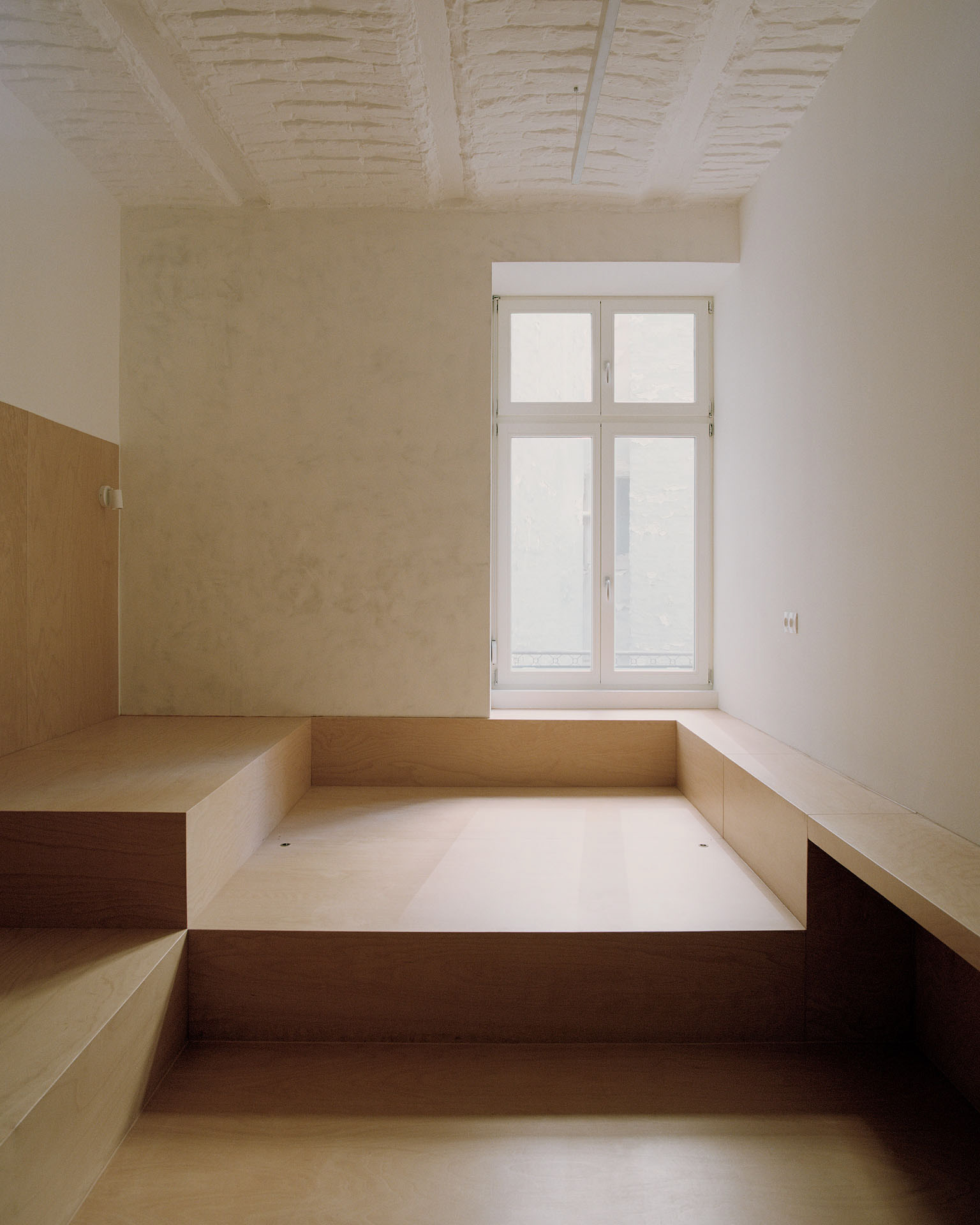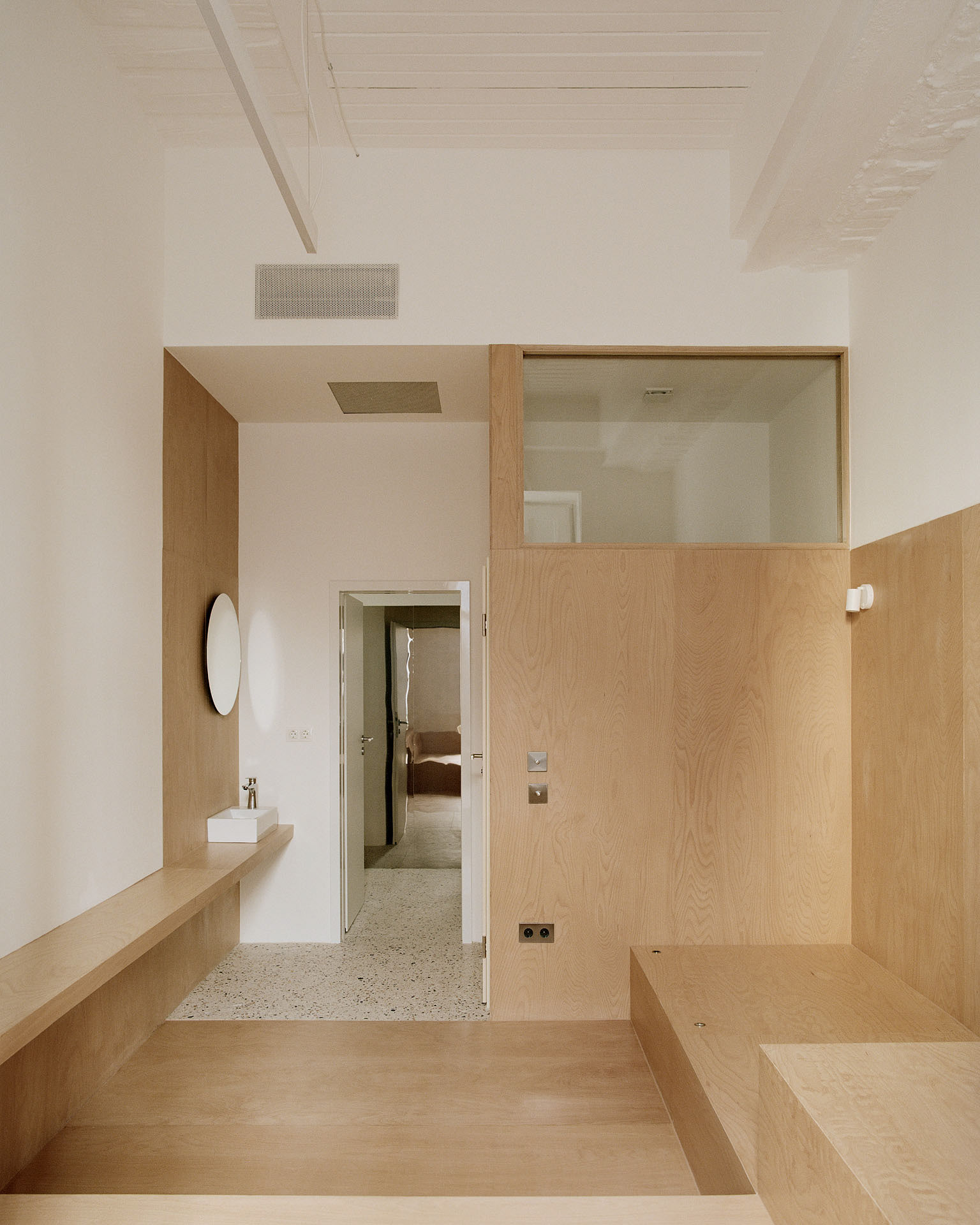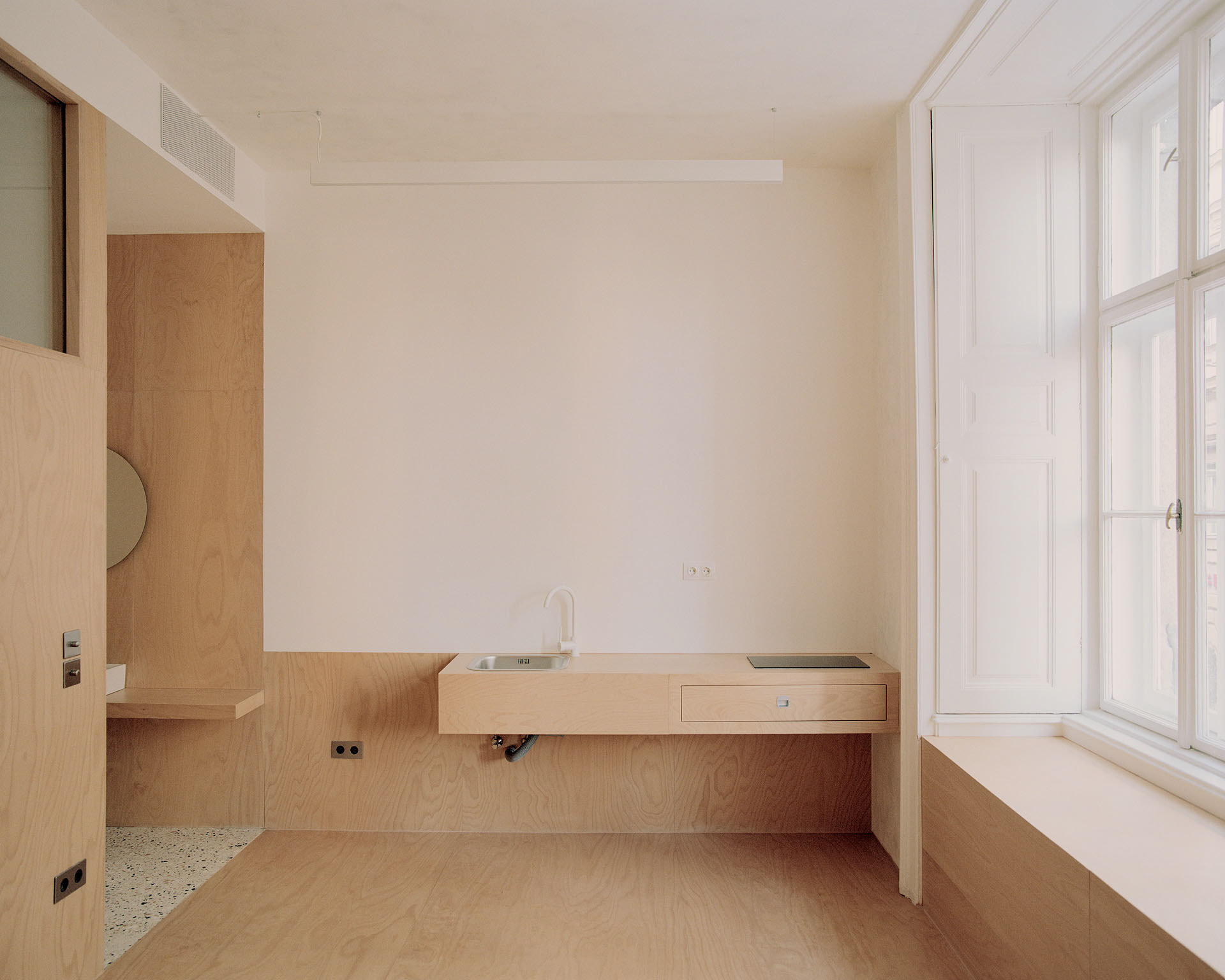 The minimum size of a hotel room’s floor area is (usually) determined by the traditional furniture and their zone of usage, which is defined according to modernist principles. Hence, the use of every point in a small room becomes specific and has a bound function, thus forcing the guest to behave in a way that is considered ideal. By contrast, we have created a space where users are able to control their environment. We imagined the room as built-in furniture: we did not design individual elements but instead created a “landscape”, the size of the horizontal surfaces of which are at different heights and exceed the minimum space that is required for a given action. Since this furniture (or rather the room) has no predefined method of use or functional constraints due to its size, guests may interpret it freely and decide for themselves how to use it.