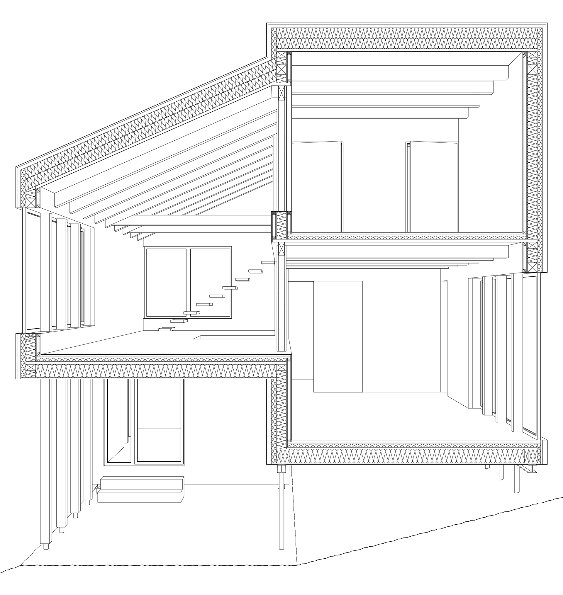 A tervezés egyik első lépéseként a ház szerkezetét érintő kérdéseket tisztáztuk. Az északi fekvésű, közepesen meredek telken rendkívül sűrű, cserjés-bozótos erdő volt. Mivel ilyen körülmények között minden építőanyag mozgatása rendkívül nehézkes, mindenképpen könnyűszerkezet alkalmazásában kezdtünk el gondolkodni. Emellett a megrendelőink számára már a tervezés megkezdésekor valós opcióként merült fel, hogy ők maguk építik fel a házukat. Szintén a környezeti szempontokat figyelembe véve úgy döntöttünk, hogy a hagyományos beton alaptestek helyett a sokkal kisebb ökológiai lábnyommal rendelkező talajcsavaros alapozást választjuk.